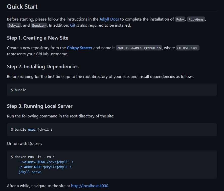 여기에 파란색으로 적혀있는 Chirpy Starter를 누르면 새로운 Repository를 만드는 창이 나오는데 거기에 레포 이름을 기입하면 된다.