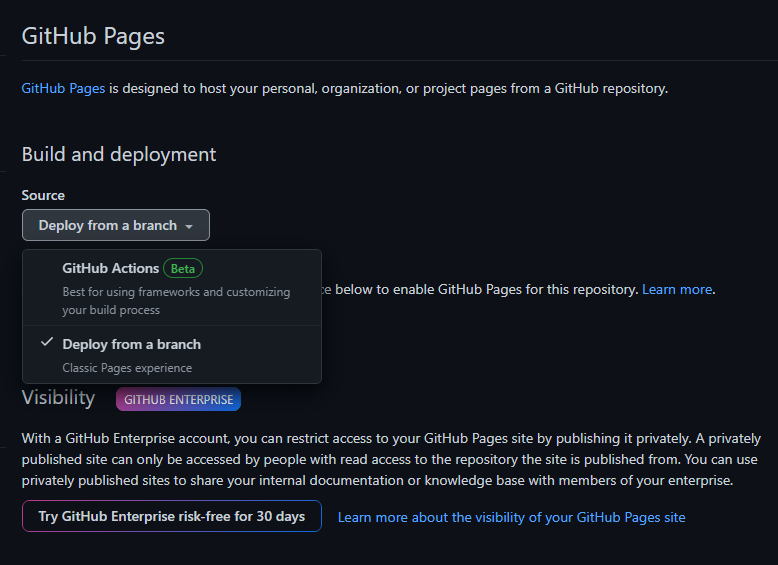 방금 만든 Repo > Setting에 들어가면 Page라는 옵션이 보일 텐데, 그걸 클릭하면 위와 같은 창이 뜬다. 여기서 Source 아래에 있는 드롭다운을 클릭해서 Github Actions를 선택한다.